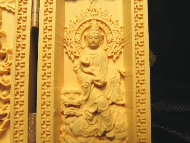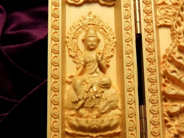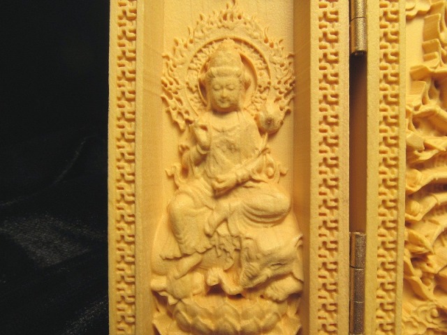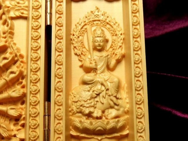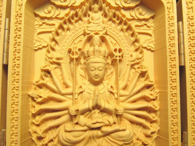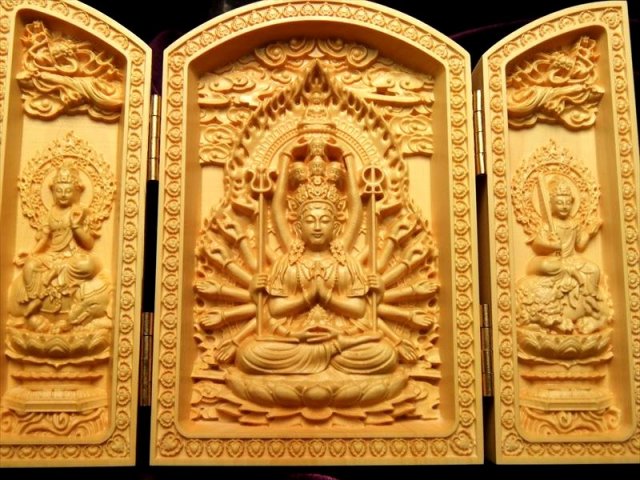 5A極上繊細彫り 木彫り千手観音像置物 人気の置物シリーズにオールウッドの置物が登場です! 天然木を使用して一つ一つ細部まで拘って彫りこんだ、観音様の極上彫刻置物!! 水晶やローズクォーツなどの彫刻置物と違い、オールウッドですので木本来の色味、木目が暖かみのある雰囲気を醸し出しています。 【仏像名と言われ】左から。 普賢菩薩 慈悲と理知で人々を救う。 千手観音 千の手と目で苦悩から救う。文殊菩薩 弁舌の向上。 千手観音の起源は中国への仏教伝来よりもはるかに古く、日本では千の眼と千の手により苦悩から救うと深く信仰の対象とされていることは言うまでもありません。 浄化用さざれと一緒に置いたり、もちろん単体でインテリアにも!お守りとしても良しです。 とても手間のかかった彫刻で、この価格は大変お買い得です!! 最後にあなたに幸福が訪れますように(*^_^*) |
