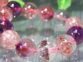 「バイヤー自ら撮影シリーズ」として、この子はここが秀でていますとバイヤーがイチ押し出来る厳選ブレス。 他にも、バイヤーイチ押しのブレスレットを見たい方は、検索窓に「バイヤー自ら撮影」と入れてください。 ここがオススメと、バイヤーが自ら撮影して、コメントも記載させて頂きます。 オススメポイント。 金属光沢の針状鉱物と粒状鉱物がバランス良く入ったオススメタイプ。 金属光沢は、蛍光灯の光でも手の平の上でブレスレットを動かせばキラキラと金属反射しますよ。 スーパーセブンとは、水晶にアメジスト・スモーキークォーツ・カコクセナイト・ルチルクオーツ・ゲーサイト・レピドクロサイトなどが内包された鉱物の通称名です。 肉眼で7種類の鉱物を全て確認できる事は非常にまれですが、7つの鉱物が内包された状態の原石をカットし、加工した石もスーパーセブンと呼ばれます。 主にゲーサイトとレピドクロサイトのどちらか、または両方により赤や紫などの色を放ち、天然とは思えないような美しさと複雑さを持った水晶・アメジストです! こちらは極上MIXタイプのスーパーセブンで、濃密なたっぷりインクルージョンと鮮やかな色みはつい見惚れる程。 ぎりぎり価格で頑張りますので、この機会に最高級品をどうぞ! |