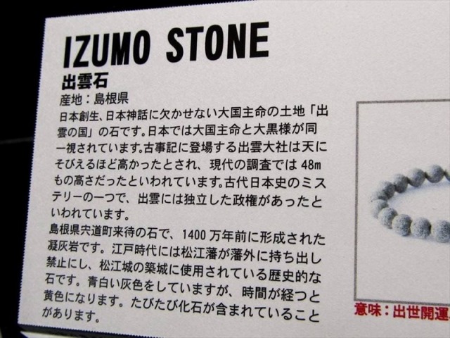 皆様のご要望にお応えして、日本銘石協会から厳選された国産ストーンブレスレットを入荷! お得な価格でお届けします! 出雲石(いずもいし) 日本創生、日本神話に欠かせない大国主命の土地「出雲の国」の石。 大国主命は、日本では大黒様と同一視されます。 古事記に登場する出雲大社は天にそびえるほど高かったとされ、現代の調査では48mもの高さだったといわれています。 古代日本史のミステリーの1つで、出雲には独立した政権があったといわれています。 島根県宍道湖東岸の石で、1400万年前に形成された凝灰質砂岩です。 江戸時代には松江藩が藩米と持ち出し禁止にし、松江城の築城に出雲石は使用されている歴史的名石です。 育む心、成長を促す、時間が経つごとに色合いをなめらかに変える石です。 たびたび化石が含まれていることがあります。 【意味合い・云われ・伝承等】 ・出世開運 ・商売繁盛 ・縁結び |