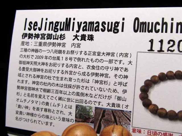 皆様のご要望にお応えして、WORLD POWERS WOOD -世界銘木協会-から厳選ウッドビーズブレスレットを入荷。 お得な価格でお届けします。 伊勢神宮御山杉 大貴珠(いせじんぐうみやますぎ おむちのたま) 三種の神器の一つ八咫鏡をお祭りする正宮皇大神宮(内宮)の大杉で2009年の台風18号で倒れたものの一部です。 大御祖神天照大神をお祀りする内宮と、衣食住の守り神である豊受大御神をお祀りする外宮から成る伊勢神宮。 正式には「神宮」と呼ばれ、内宮・外宮を始め、125社から成り立っています。 約2000年前、天照大御神の鎮座地を探して各地を巡っていた倭姫命が、天照大御神のお告げにより五十鈴川のほとりに内宮を建てたのが伊勢神宮の起源といわれています。 その神域とされる神宮の杜で生まれ育った杉は「神宮杉」と呼ばれます。 神宮の杜内の木は伐採が許されていないため、伊勢神宮御神木で樹齢三百年以上の風倒木などだけが「御山杉」と名前を変えてごく稀に世に出回るのです。 大貴珠(オオムチノタマ)の貴(ムチ)とは「貴い神」を表す尊称とされ、大変貴い神様からの珠という意味の名がつけられています。 【意味合い・云われ・伝承等】 ・日頃の感謝 ・大吉 ・福徳 ・招福 |
