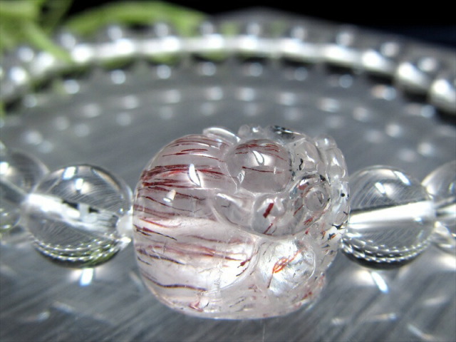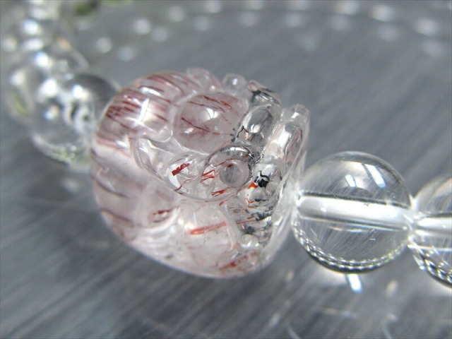 透明感のあるスーパーセブンを細密に彫り上げたヒキュウと 全てを浄化し活性化させる万能ストーンな水晶を組み合わせたブレスレットが数量限定で入荷しました。 内包物がバランスよく入っており非常に美しいタイプのスーパーセブンです。 濃厚な赤みとキラキラとした輝きは、華やかさ一押しです。 スーパーセブンとは、水晶にアメジスト・スモーキークォーツ・カコクセナイト・ルチルクオーツ・ゲーサイト・レピドクロサイトなどが内包された鉱物の通称名です。 肉眼で7種類の鉱物を全て確認できる事は非常にまれですが、7つの鉱物が内包された状態の原石をカットし、加工した石もスーパーセブンと呼ばれます。 様々なインクルージョンと共に産出する水晶ですが、スーパーセブンは最も有名で不動の人気を誇る水晶です。 【貔貅ヒキュウとは】 金銀などの財宝を主食とする中国神話の神獣で、財運アップに絶大な効果を持つとされています。 中国では「一回触ると運勢アップ(運程旺盛)、二回触ると財運アップ(財源滾滾)、三回触ると出世する(平歩青云)」と言われ、特に商売人には大切に扱われているそうです。 【意味合い・云われ・伝承等】 スーパーセブンは、インクルージョンされているそれぞれの鉱物がお互いのパワーを補い、増幅し合っているので、とても強いパワーを発揮するとされています。 スーパーセブンは「メロディーストーン」とも呼ばれ、7つの異なる鉱物が結晶内に含まれています。 これらの鉱物には、パワフルなスピリチュアルな特性があるとされ、精神的な成長や洞察を促進し、ヒーリングとバランスをもたらすと云われています。 エネルギーヒーリングや瞑想に使用され、ストレスの軽減や内面の平和を促進することが期待されています。また、浄化が不要であり、最も力強いパワーストーンの一つとして認識されています。 |