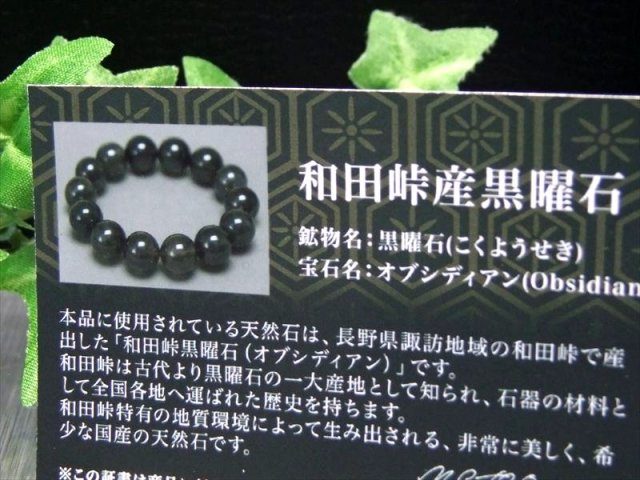 和田峠産の黒曜石は不純物が少なく、特に旧石器時代・縄文時代には石器の材料として全国に流通するほど品質が優れています。 こちらは和田峠産の黒曜石の特徴でもある、光に透かして見ると半透明に透ける美しいオブシディアンです。 不透明で漆黒なオブシディアンよりも、軽やかな印象があります。 【意味合い云われ・伝承等】 オブシディアンは『魔除けの石』として有名で、主に【怒り・悲しみ・恐怖】などの、ネガティブなエネルギーから持ち主を守る力があると云われています。 また直接的なエネルギーを持ち、マイナスの感情や衝動を抑え、精神的成長のサポートをすると云われます。 数に限りがございますので、お早めに! |