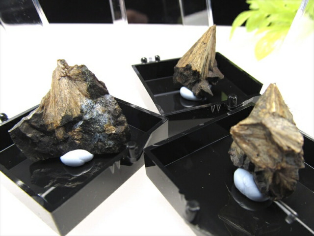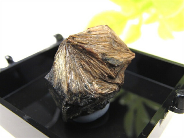 頑火輝石(エンスタタイト)は、ケイ酸塩鉱物の一種で、マグネシウムを主成分とする斜方輝石です。 学名は、ギリシャ語で『対抗する』を意味する"Enstates"にちなみます。融点が高く約1400 ℃に加熱しないと、溶け始めません。そのため「頑なに火に対抗する」と言われ、これが鉱物名の由来です。 昭和40年代の水石ブームの折に「菊寿石」と呼ばれ珍重されました。母岩は蛇紋石にクロム鉄鉱が混じったもので、頑火輝石が放射状に集合する様子が見事です。 |
