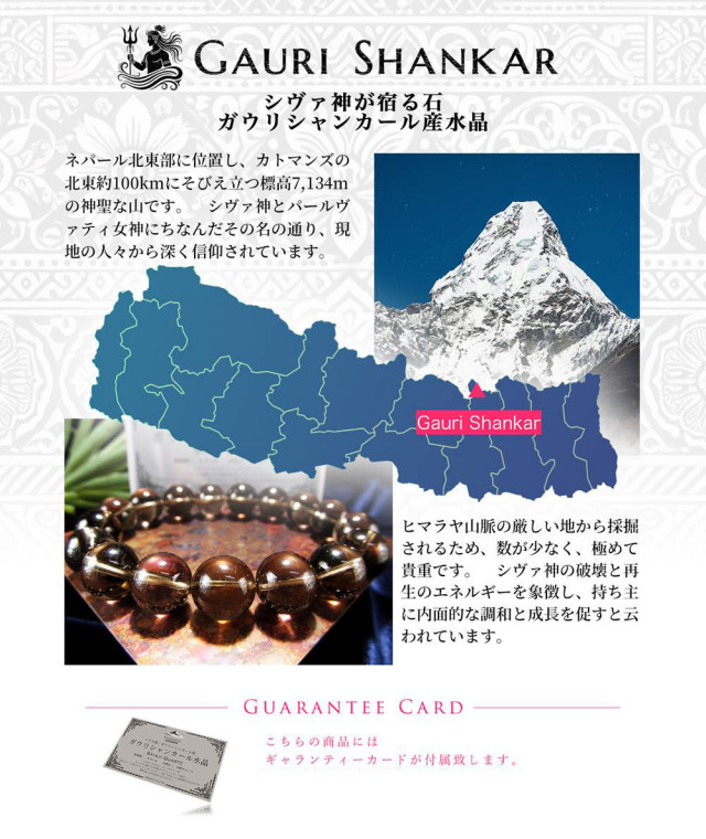 希少なガウリシャンカール産スモーキークォーツポイント原石が入荷しました! ガウリシャンカールクォーツは、限られた人にしか採掘を許可されていないため、産出量はあのガネーシュヒマール産よりも少ないといわれています。 巡り合えること自体が奇跡と言っても過言ではないスモーキークォーツです。 ガウリシャンカール山とは、ロールワリン・ヒマール山群に属する標高7.135mの山の名前で、ヒンドゥー教の神様の名前に由来する聖なる山の一つです。 地球上で最も高い波動を持つパワースポットとして知られるヒマラヤ山脈の中に在ります。 崩れ落ちた崖の斜面より採掘されるためダメージを受けやすく、採掘量も減少している大変希少なクリスタルです。 またネパール政府の方針で国外に持ち出すことに強い規制をかけており、入手も大変困難となっております。 一切手が加えられていない天然非加熱のスモーキークォーツなので、色合いに個性があり魅力的です! 限定入荷ですので、お買い逃しなく!! ガウリシャンカールは、ネパール北東部にそびえる神聖な山、ガウリシャンカール山に由来しています。 この山は標高7000メートル級で、ネパールとチベットの国境に位置し、ヒンドゥー教の神シヴァとその妻パールヴァティ(ガウリーとしても知られる)にちなんで名付けられました。 ネパールの人々にとって、この山は神聖な存在で、深い信仰の対象です。 ガウリシャンカール水晶は、特にヒマラヤ山脈の険しい場所から採掘されるため、その数が限られており、非常に希少です。 スモーキークォーツは、水晶の中でも、身体と大地とのエネルギーを繋げる力に非常に適した石です。 この石は心身を安定させ、持ち主の精神を安定した方向へ導く力があります。 また、恐怖や不安を解消するのにも役立ちます。 さらに、スモーキークォーツは他人の悪意や、霊的、環境的なマイナスエネルギーから持ち主を守る力を持っています。 そのため、邪気払いのお守りとしてもオススメです。 |
