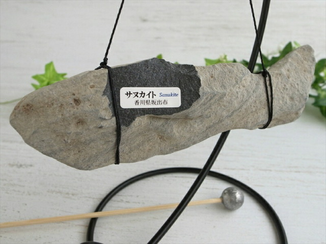 讃岐の名石として知られるサヌカイトは黒色緻密で堅く、たたくとカンカンと金属音を出すので、属に「カンカン石」と呼ばれています。 割ると鋭利な角崚や貝殻状の割れ口を呈することから、縄文~弥生時代の生活用具として、矢じりや石刀など人類発展に大きな役割を果たしました。 江戸時代の頃から「磬石(けいせき)」として親しまれ、石琴などの楽器や合図用に使われてきました。 大正時代から香川県綾歌郡国分寺町の民有地で産出され、土産物としても重宝がられています。 1891年にドイツの岩石学者ワイシェンク(Weinschenk)が来日して研究し、世界で珍しい感関として、産地の旧国名讃岐にちなみ、サヌキット(Sanukit)と命名して報告しました。 これが英語読みのサヌカイト(Sanukite)となり、世界的にも有名になり、日本でも「讃岐岩」として知られるようになりました。 1919年には小藤文治郎がサヌカイトと近縁な性質を有する瀬戸内地域の中新世火山岩をサヌカイト類(またはサヌキトイド)と名付けました。 【楽器として】 固いもので叩くと高く澄んだ音がします。 博物館などで長さの違う石片を並べて木琴のように叩いて音を出す「石琴」(楽器名:サヌカイト)などの展示物やコンサートに使われています。 楽器としての演奏者も存在し、香川県の公共施設ではBGMとして流されています。 |