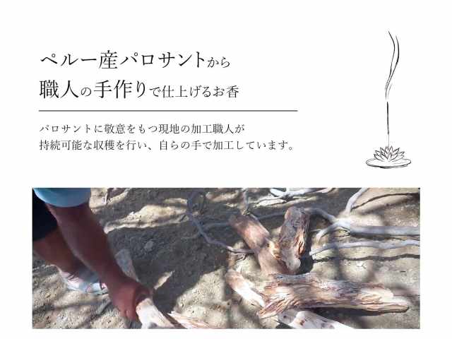 パロサントは「聖なる樹」と呼ばれ、古代インカ帝国のシャーマンが火を点けると立ち昇る甘く芳ばしい煙は悪霊を追い払い幸福を呼び込む香木として大切にしてきました。 現代に伝承され儀式で悪霊を追い払う際に使用されます。 こちらはペルー産パロサントで、苗木から育て植林し、自然を守りつつ10年以上経って自然に枯れたパロサントの樹を伐採して使用しております。 パロサントに対して敬意をもつ職人による、乱獲ではない持続可能な収穫管理のもと、 手作りで仕上げられた神木のスティックタイプのお香です。 ペルーのハンドロールインセンスは通常7 8mm程度で太いものが多く、 屋外でも使うことのできる仕様ですが、こちらは太さ5mm前後の細めのタイプです。 お部屋の浄化に使う場合にちょうど良い太さとなります。 また、芯が平らになっており、手で持つときにはとても持ちやすいですが、 香立ての穴が小さい場合には入らないことがありますのでご注意くださいませ。 ※火を点す場合は取り扱いにご注意くださいませ。 |