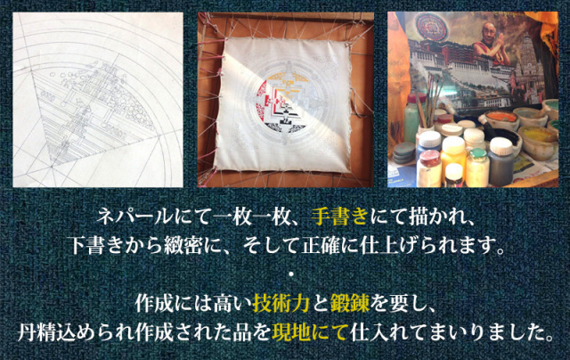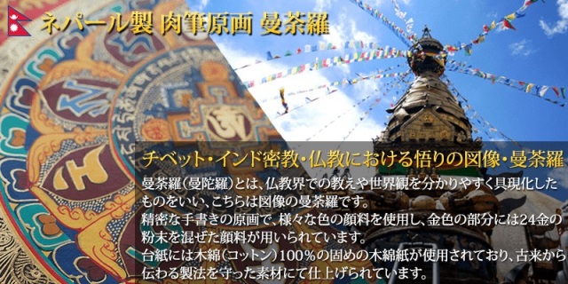 【チベット・インド密教・仏教における悟りの図像・曼荼羅を直輸入】 曼荼羅(曼陀羅)とは、仏教界での教えや世界観を分かりやすく具現化したものをいい、こちらは図像の曼荼羅です。 様々な種類が存在し、それぞれの曼荼羅によってその内容や表現方法には違いがありますが、どの曼荼羅でも単純な絵柄ではなく、 その絵柄や文字が意味をなしており、世界観・宇宙観・悟りの境地などがわかりやすく示されています。 精密な手書きの原画で、様々な色の顔料を使用し、金色の部分には24金の粉末を混ぜた顔料が用いられています。 台紙には木綿(コットン)100%の固めの木綿紙が使用されており、布と紙の中間のような質感で、古来から伝わる製法を守った素材にて仕上げられています。 こちらは外枠のカラー部分やデザインの細かい部分は、写真と異なる場合があります。 どれも職人が一つ一つ丁寧に手で書き上げた美術作品ですので、お楽しみに。 【種子曼荼羅】 仏を表す文字を仏教では種子(しゅじ、あるいは「種字」とも)と言うことから、「種子曼荼羅」とも言う。 諸仏の姿を直接描く代わりに、1つの仏を1つの文字(サンスクリット文字、梵字)で象徴的に表わしています。 【タンカとは】 チベット仏教の教えを目に見える形にすることでその教えを理解しやすくすることを助けるもので、 チベット僧の重要な行いの一つの「瞑想」の手助けをするものになります。 ネパールやモンゴルで信仰されている、チベット密教仏画の、掛け軸になり 曼荼羅の掛け軸は「タンカ」ということになります。 ※まとめての出品になります。サイズ、デザイン、カラーが画像と異なる場合がございます。 ※ディスプレイ環境によって色みが異なって見える場合があります。 ご了承ください。 ※サイズ表記より1?2cmほど差がある場合があります。 ※綿やインクの匂いがします。 ご理解の上ご利用ください。 ※綿100%の素材を使用し、海外直輸入品ですので端や角にすれや小さな破れがある場合があります。ご了承ください。 ※宗教自体や曼荼羅に関する記述には異なる説が存在します。 異なる解釈での記載がある場合があります。 |