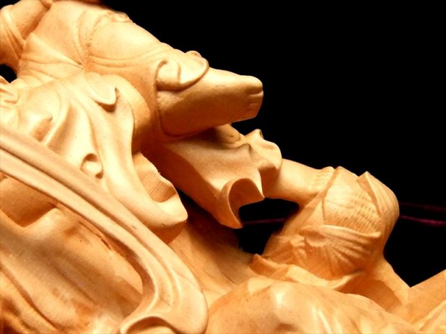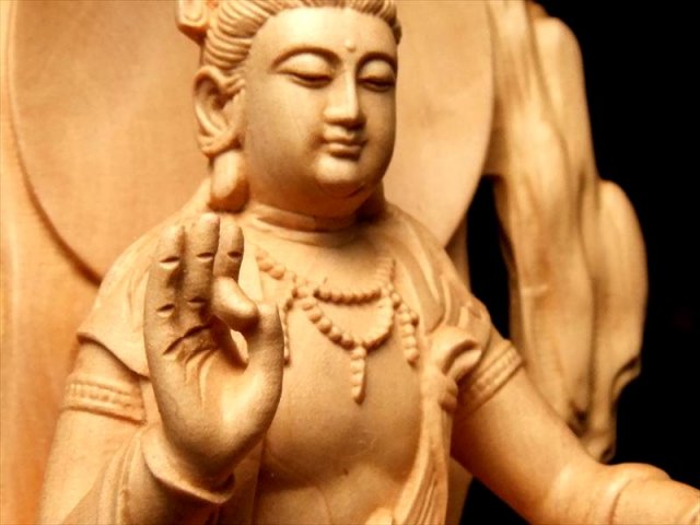 立体透かし彫刻 白衣観音像置物 人気の置物シリーズにオールウッドの観音様置物が登場です! 観音様本体の背中部分や、足、腕から垂れる衣、印を結ぶ指まで透かし彫刻で彫られた逸品 透かし彫りなので、正面から見た時の立体感がより強調され、神々しいオーラを放ちます。 観音菩薩の起源は中国への仏教伝来よりもはるかに古く、日本では深く信仰の対象とされていることは言うまでもありません。 こちらは白衣観音(びゃくえかんのん、びゃくいかんのん)という観音様で、古くからインドで崇拝されていたとされ、仏教に取り入れられてからは阿弥陀如来の明妃となり、観音菩薩の母とも仰がれて、その後、観音菩薩の変化身の一尊として信仰されるようになったとされています。 【仏像の姿勢】 座っている像は人々を救う方法を考えておられる姿とされています。 【香榧木】 榧木(カヤ木)の木は堅実で、腐りにくく、造船や高級の家具は材料としてよく用いられます。 木目は繊細、色つやは金色で美しく仏像の彫刻によく使われ癒しの木とされています。 浄化用さざれと一緒に置いたり、もちろん単体でインテリアにも!お守りとしても良しです。 |