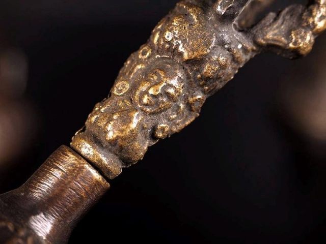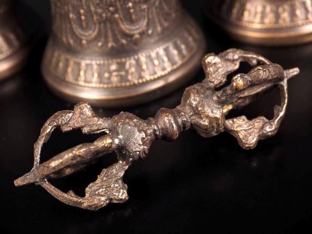 アンティーク ガンター & ヴァジュラ セット チベットの代表的な密教仏具であるガンターとヴァジュラのセットです。 アンティークガンターセットですので、錆等ございますが、それを加味してもこの価格はかなりお得となっております。 ベルとしてのみならず、ヴァジュラで優しく音を鳴らすとシンギングボウルと同様の使い方ができます。 奏で方によって音色が異なり、サイズも大きめなので音の迫力もありとても魅力的です。 デザイン性も高く、マルチに使えるアイテムなのでマストです。 儀式の際に右手にヴァジュラ、左手にガンターを持ちます。 ヴァジュラは男性原理である【方便(他者を救済する力)】、ガンターは女性原理の【智恵(真理)】を象徴し、その両方を手にすることはそれらの合一を意味しています。 少数のみの限定入荷ですので、お買い逃しなく!! 【意味合い・云われ・伝承等】 【ガンター(金剛鈴)とは】 鐘の音は神を歓迎し、魔を払いのける音色があると考えられています。 縁起の良いとされるベルの音は、雑念の精神状態から精神をコントロールし、物事に集中するのに役立つと言われています。 本場チベットでは、ガンターに強力な力を秘めていると考えられており、一般的なお守りとして使用されています。 【ヴァジュラ】 チベット密教で使われる法具【五鈷杵(=ヴァジュラ)】の一種で魔を払い、身を守る密教を代表する法具です。 弘法大師、愛染明王、金剛夜叉明王さまが持っています。 気の浄化を助けてくれると云われています。 本場チベットでは、ヴァジュラに強力な力を秘めていると考えられており、一般的なお守りとして使用されています。 |