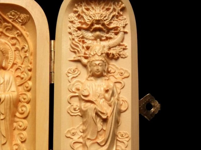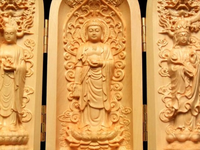 釈迦如来 木彫り 立像仏様 置物 人気の置物シリーズにオールウッドの置物が登場です! 中央に釈迦如来像、両脇に地蔵菩薩(向かって左)観音菩薩(向かって右)が彫られています。 【釈迦如来】 実在した唯一の如来と云われ、仏教の開祖であるブッダです。 【ご利益】 煩悩(心の迷い)を清め心安らかに生きられる様導くとされています。【仏像の姿勢】 立っている像は人々を救おうと立ち上がった姿とされています。 職人が一つ一つ細部まで拘って彫りこんだ、仏様の極上彫刻置物!! 水晶やローズクォーツなどの彫刻置物と違い、オールウッドですので木本来の色味、木目が暖かみのある雰囲気を醸し出しています。 観音菩薩の起源は中国への仏教伝来よりもはるかに古く、日本では深く信仰の対象とされていることは言うまでもありません。 地蔵菩薩は、日本でもお地蔵様として馴染みがあり、地獄の果てまでも救いの手を差し伸べられると云われています。 浄化用さざれと一緒に置いたり、もちろん単体でインテリアにも!お守りとしても良しです。 とても手間のかかった彫刻で、この価格は大変お買い得です!! 最後にあなたに幸福が訪れますように(*^_^*) |