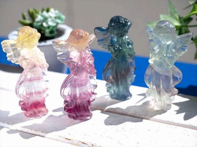 マルチカラー フローライト エンジェル 彫刻置物 可愛らしい天使をモチーフにしたフローライト置物が入荷しました! パープルやグリーンなどカラーバリエーションが豊富なことで知られるフローライト! こちらはブルーグリーンやパープルカラーのフローライトを使用しています。 ひとつひとつ色の入り方が異なるので、どれが届くかはお楽しみです。 細かな部分まで彫り込まれているので高級感がありますよ! 【意味合い・云われ・伝承等】 フローライトは『天才の石』とも称される事もあり、大人になるにつれて固定化されてきた思考パターンや抑圧された感情から自分自身を解き放つ為に働き、子供の頃の自由で無邪気な発想や思考力を高めてくれると云われています。 また、脳を活性化させて思考の幅を拡げ、受験のお守りになるなどの云われもあります。 天使をモチーフにした置物は、気を浄化する作用があり、マイナスな気を消す効果があると云われています。 玄関に置くことで、悪い気を寄せつけない魔除け的な役割も果たしてくれるそうですよ! |