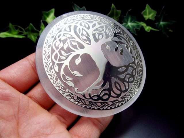 | 美品キャッツアイ セレナイト (ジプサム 透石膏) ツリー・オブ・ライフ サークル型プレート |