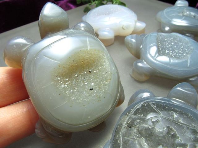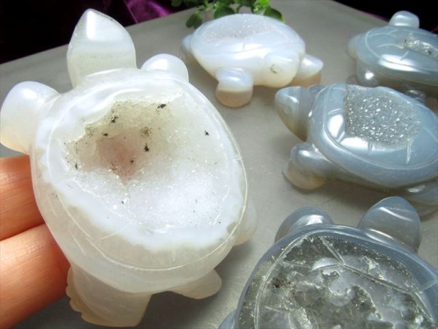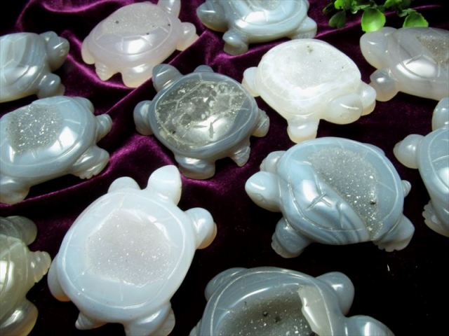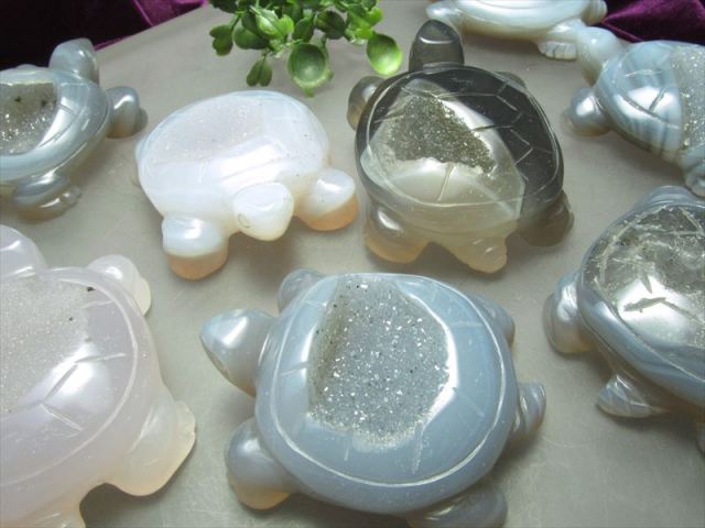 『笑顔のような石』『笑口』と呼ばれる笑口アゲートカメの彫刻置物が入荷しました!! ジオードを滑らかに磨きました! 水晶は通常、母岩となる石英や瑪瑙などの鉱物に空いた空洞が珪酸水で満たされ、その水中で成長します。 晶洞とはその内側が結晶で埋め尽くされた空洞状の石です。 中には全体が水晶になっているものや、空洞が大きめなもの、アメジストが混ざったもの、マンガンの水溶液が石の中のクラックなどに染込んで出来た美しい黒い点や美しい樹枝状模様を生成した「デンドリック」が入っているものもあります。 天然石の魅力たっぷりの置物です アゲートは非常に強力な邪気払い、魔除けの石と云われています。 物そのものが魔除けの象徴としてバリアーのような働き方をするため、必ずしも持ち主と強く同調する必要はなく、お守りの感覚として使えます。 流通の少ない笑口アゲート!この機会にぜひ!! ストーンキーワード 邪気払い、魔除け 災難から身を守る |