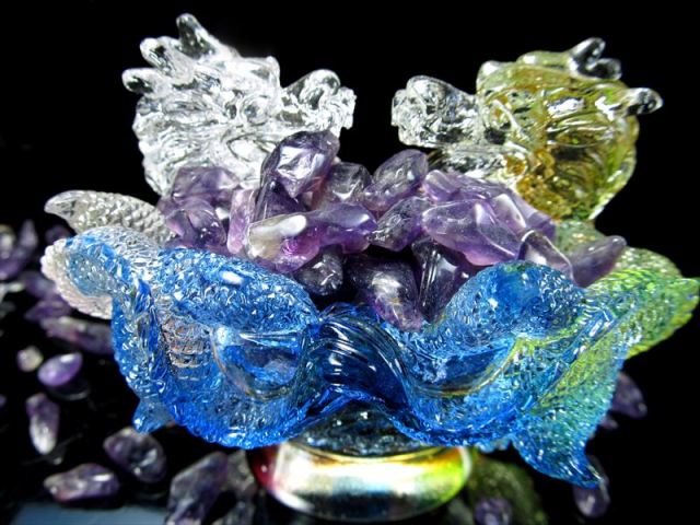 2匹の龍装飾 聚寶盆(じゅほうぼん) ガラス製の置物・雑貨・ディスプレイ入荷です 虹色にカラーリングされたガラス製の置物です。 小粒のさざれが約60グラムほど入る深さがあり、インテリアとしてもお使いいただけます! 【聚寶盆(じゅほうぼん)とは】 中国では中が空洞でお盆の形をしたものを聚寶盆(じゅほうぼん)と呼びます。 もともとは道教の神様である財神の寶具で、宝箱の意味が有り、飾って置くと財がどんどん溜まっていく云われています。 財運アップ・招財に相性抜群の組み合わせです! この機会に是非!! ※1点物につき画像は現物を撮影しています。 ※ガラス製品ですので取り扱いにはご注意ください。 ※サイズは目安です。 細かな誤差が出る場合があります。 ※表面には細かな凹凸がある場合がありますが、破損ではございません。 ※出来る限り自然な色みになるよう撮影を心がけておりますが、お使いのディスプレイ環境によって表示される色みに差が出る場合があります。 ご了承ください。 最後にあなたに幸福が訪れますように(*^_^*) |