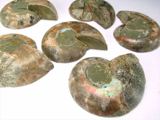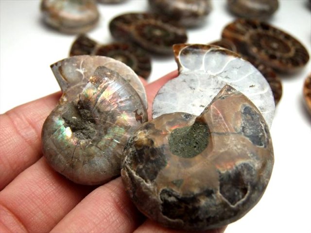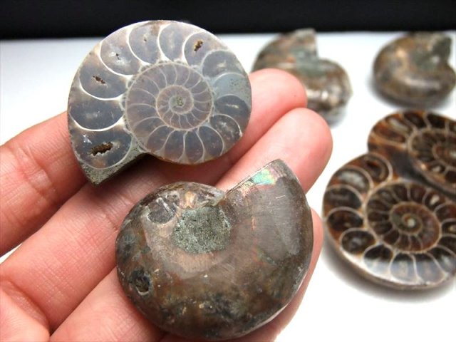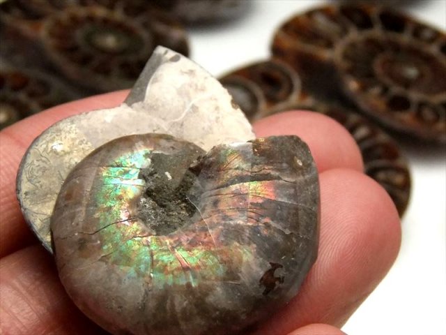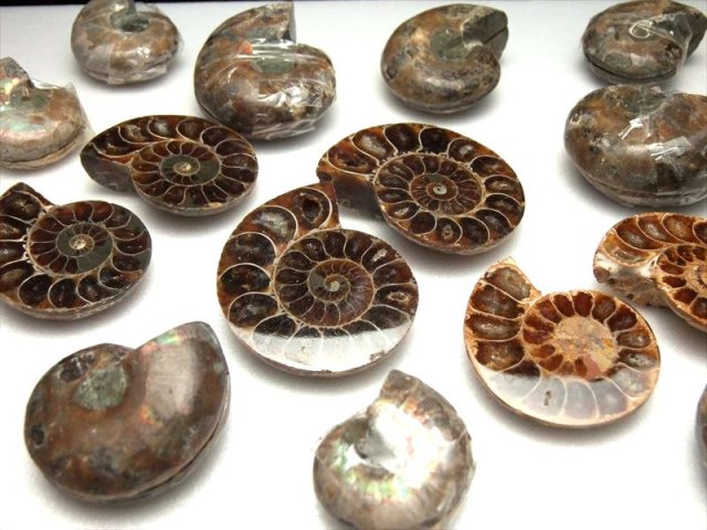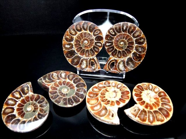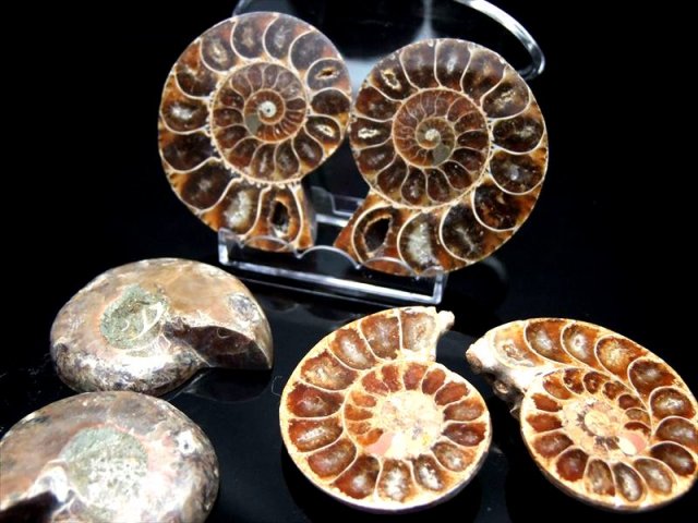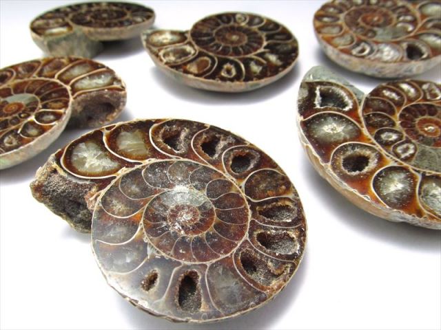 超美品!1つの化石を真っ二つに割った2枚セットのアンモナイト化石置物を入荷しました! 隔壁内の窪みには綺麗にカルサイト化している大変美しいアンモナイト(クレオニセラス)の化石です。 スライス加工もキレイで、ツヤツヤです。 気の遠くなる年月が1個の形に凝縮されて現代に存在しているのが不思議なロマンを感じますね。 風水的にもアンモナイトは幸運グッズとして有名です。 中には裏面に樹木模様のテンドリックがあるものも!届いてからのお楽しみです! 【アンモナイト】 アンモナイトは先カンブリアの中生代のジュラ紀(2億1300万年 1億4400万年前)に恐竜と共に栄え、白亜紀(1億4200年前 6500年前)に共に絶滅した頭足類で、イカやたこの仲間に属します。ラテン語で神(ammon)の石(ite)を意味するアンモナイト。コレクションとしてまたは収蔵の極上珍稀品です 独特な形から、絵や音楽などの芸術面での才能を開花させる効果があると言われたり、全体的な運気を上げてくれるとも言われています。 |
