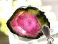 女性に大人気のレアストーンでるウォーターメロントルマリンペンダントトップが限定新入荷致しました!! その名の通り、ウォーターメロン(スイカ)のような配色からそう名づけられたトルマリンで、グリーンとピンクが合わさった部分のみがウォーターメロントルマリン と呼ばれるため、原石から少量しか削りだせない希少なトルマリンです! そんな希少なトルマリンの超透明濃厚カラー極上品です! 自然のトルマリン結晶を金太郎飴のようにスライスして出来たナチュラル感たっぷりのペンダントです。 注目すべきは発色と透明度です! 安いものだとくすんだ色のものが多いですが、こちらはピンクもグリーンもハッキリしています! 希少でとても高額なトルマリンの結晶からできた希少なペンダントトップです。 この透明感、色合い、お値段、どれをとっても文句なし!当店イチオシ商品ですよ!どうぞお買い逃しなく! |