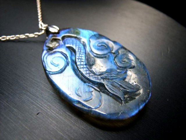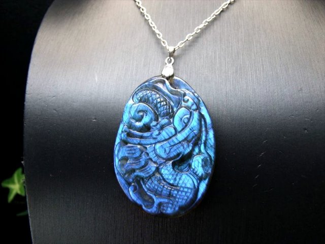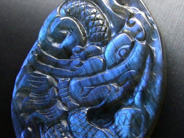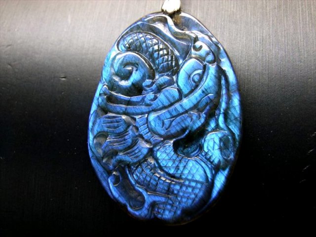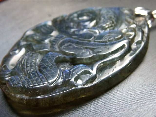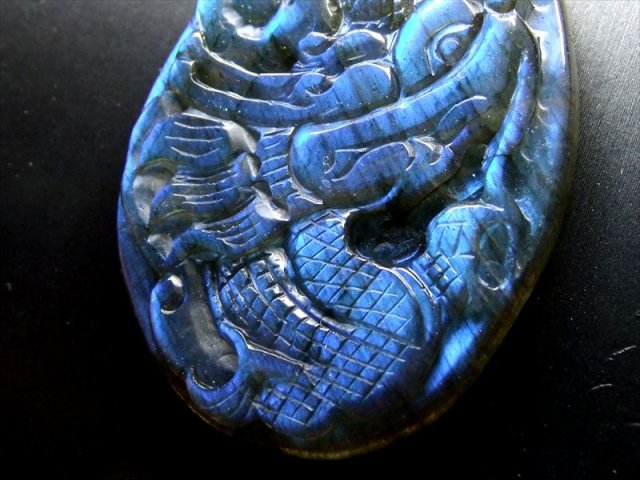 ロイヤルブルー ラブラドライト 龍神 立体彫りペンダントトップ ロイヤルブルーシラーのラブラドライト原石を使用した立体龍神彫りペンダントトップです! 裏面もデザインされており、両面共に合成写真かと疑ってしまうほど鮮やかな全面シラー! これ以上は無い、悶絶のロイヤルブルーシラーの出る極上のラブラドライト原石を、細部まで一つ一つ職人が手彫りで仕上げた、極上彫刻品です 銀河を思わせるようなシラーはついつい見入ってしまう神秘的な逸品です ストーンキーワード 内面的な自己開発へと導く。 新しい意識を開発する。 |