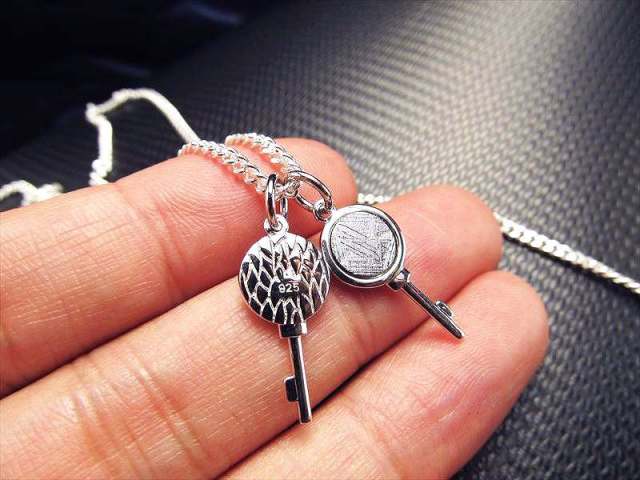 鉄隕石であるギベオンメテオライトペンダント入荷です!! 神秘的なウィドマンシュテッテン構造と言われる網目模様は、鉄とニッケルが非常に長い時間をかけて ゆっくりと冷えて固まることから生まれるものと言われます。 これは地球上では再現することが不可能と言われ、成分的にも地球上には存在しない物質が、超微量ですが、含まれていると言われます。 こちらは可愛らしい鍵モチーフペンダントの中心にギベオンが大きく浮出しており、神秘的な模様がアクセントになります! デザイン性の高いオシャレなペンダントトップですので、どんなファッションにも映えること間違いなしです! 隕石好きにはもちろんですが、デザイン重視の方にも大変オススメの商品です! |