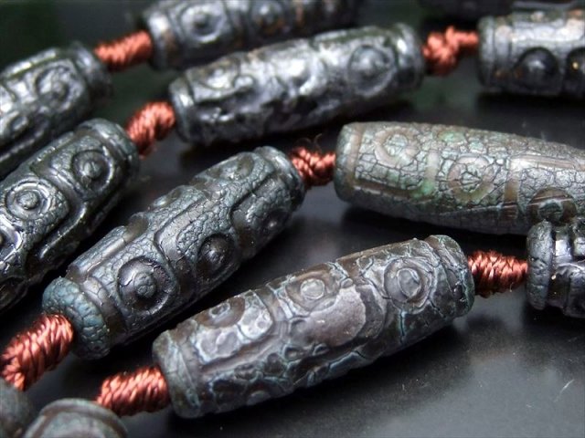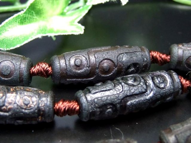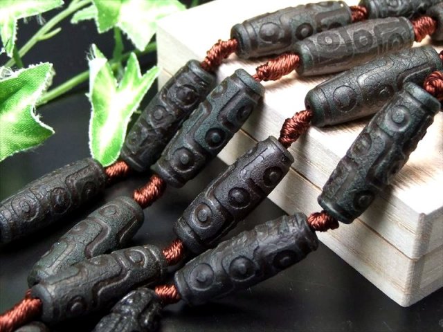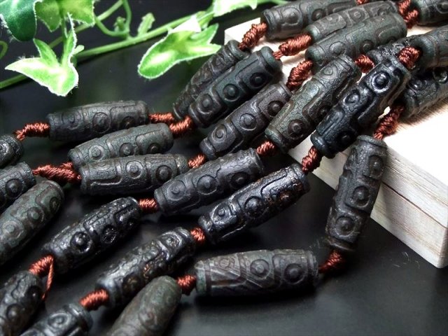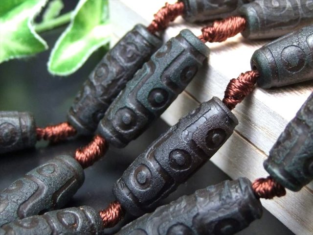 唯一無二の黒天珠。 艶抜きの黒やうっすら青銅色のものなど古代浮彫紋様天珠加工が他の天珠とは一線を画すレア商品です。 他店ではなかなか見かけない艶無し黒天珠をどうぞ! 一連に10個の天珠がついています。 限定入荷ですのでお早めに! 【意味合い云われ・伝承等】 9は宇宙の理法を示す形であり、潜在能力が開発されて、極大利益が得られるとされています。 全ての災いは消滅し社会で成功や信頼が得られ、権威や権力を獲得でき、名声を手にして巨万の富が築けると云われています。 【古代浮彫紋様天珠】 通常の天珠とは違い、浮き彫りの彫刻が施され、なおかつ風化したような見た目の特殊な天珠です! 一般的な至純天珠のようなつるんとした質感にはない、時代を感じさせるしっとりとした質感です! |