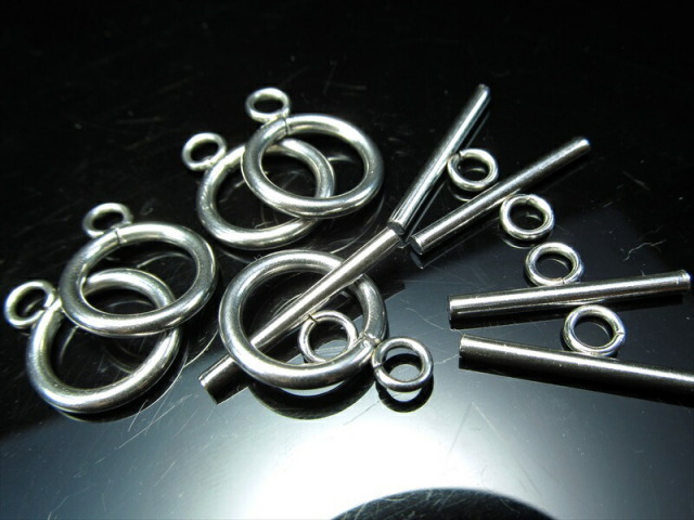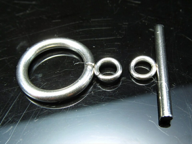 激安副資材 お客様のご要望により、導入致しました!! ネックレスやブレスレットの留め具の定番のマンテルです。 留める時:リングの中にバーを通し、通したバーを横にしてください。 外す時:バーをリングの中にくぐらせてから引き抜いてください。 |