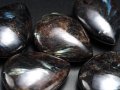 希少なヌーマイトのタンブルが入荷致しました! ヌーマイトはグリーンランドの北部ヌーク地方で近年発見された希少石で、黒い中にキラキラと光る部分のある神秘的な石です。 名前の由来は、産地である“ヌーク地方”から名付けられ、別名ヌーミットとも呼ばれています。 太古の天然石 発見は近年ですが、約30億年前に火山の変成作用の影響で出来た石なので、歴史のある強力なパワーを持つ石で、保護力や存在能力を活性化させると云われています。 独特な色合いと美しい輝き 反射する部分はブルーやゴールド、中にはグリーンやシルバーにも輝く珠もあります。 黒ベースの中から輝く様子は、高級感のある落ち着いた印象の天然石です ヌーマイトの輝きは、サンストーンやラブラドライトなどの長石系とも異なる輝き方を放つことから大変人気があり、近年激減している石のひとつです。 ぷっくりとしたドロップ型が5個セットになっています。 お守りやペンダントへの加工にも最適です! 超お買い得ですのでお早めにどうぞ!! |