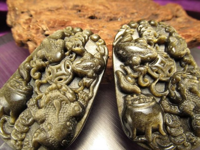 大人気!銭蛙【三本脚のカエル】の彫刻が施された特大サイズのカービングプレートが入荷いたしました!! ゴールデンシャインオブシディアンのプレートに、財運・開運の云われのある銭蛙を彫り込んだ、迫力のあるプレートです まるで飛び出すかのような極上彫刻が素晴らしい秀作です! バチカンや丸カンを付ける穴が開いていますので、ペンダント・ネックレスとしてもお使い頂けますよ 銭蛙【ゼニカエル】とは 古来より中国では、三本脚のカエルは旺盛な財を集めてくれる存在として大切にされてきました。 三本脚のカエルは開運、幸運を招く力と財を四方八方から集めて、金運、財運を良くし、家の財はもちろんの事、会社やオフィス、店舗などでも財を集めてくれると云われています。 |