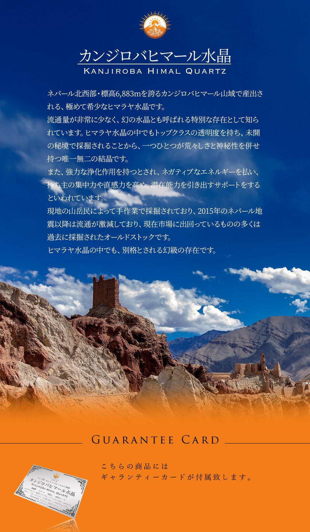 カンジロバヒマール水晶は、ネパール北西部のカンジロバ地域、標高6,883mのカンジロバヒマール峰を中心とするヒマラヤ山域で産出される、流通量極少の特別なヒマラヤ水晶です。