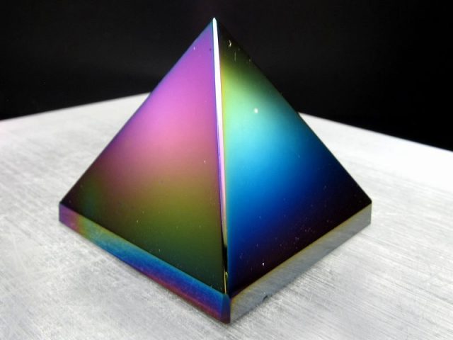 魔除け・厄除けの石として有名なオブシディアンに、人気のオーラ加工、虹色に輝くメタリックレインボーカラーを施しました。 ビスマス結晶を思わせるカラフルな色味が魅力的です、ブラックアクアオーラとも呼ばれ、チャクラカラーを備えるレインボーカラーのオーラは、各種オーラの中でも特に強い波動があると云われています。 オブシディアンの魔除け・厄除けパワーをピラミッドパワーとレインボーオーラで増幅させた、オススメの置物です。 眺めているだけで宇宙を感じてしまいますよ。