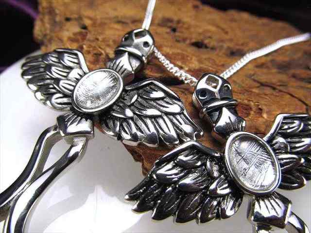 こちらは可愛らしいウィングクロスモチーフペンダントの中心にギベオンが大きく浮出しており、中心から下部にかけて剣が装飾され、インパクトのあるデザインになります!
