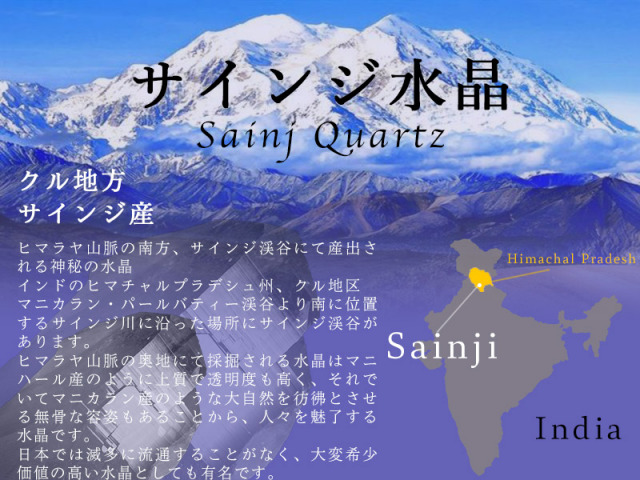 正真正銘のヒマラヤ水晶さざれを現地より直輸入いたしました! サインジクォーツとしても知られるこの神秘的な水晶は、ヒマラヤ山脈の南側にあるサインジ渓谷で産出されます。 インドのヒマーチャルプラデーシュ州クル地区マニカラン・パールバティー渓谷の南、サインジ川沿いにサインジ渓谷が広がっています。 この渓谷で採掘される水晶は、上質で透明度が高く、マニハール産のように洗練された美しさと、マニカラン産のような荒々しい自然の魅力を兼ね備えており、多くの人々を魅了しています。 日本では滅多に流通することがなく、大変希少価値が高い水晶として有名です。 直輸入で大量仕入れの為、お求めやすい価格を実現することができました! 数量限定のベストプライスにてお届けいたします。 滅多に入荷のない商品ですのでお買い逃しなく!